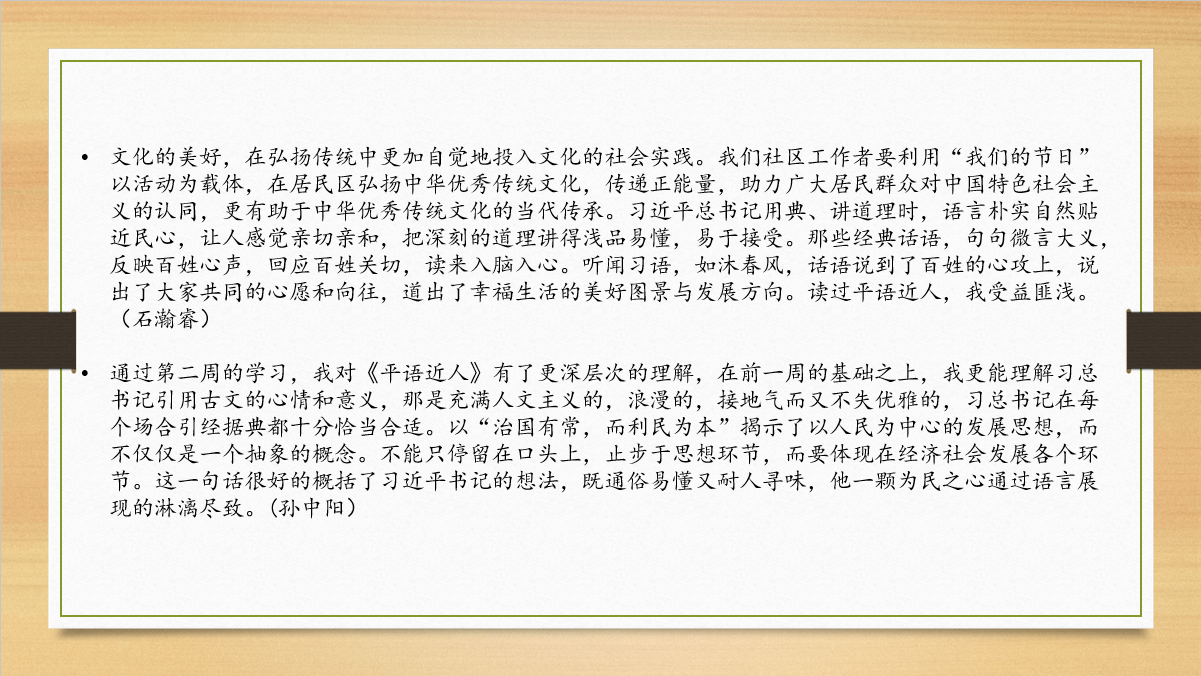 《习近平谈治国理政》讲述了习近平总书记“以人为本”的治国之道和将人民放在第一位的治国之心。“习语为常”模块读书小组通过ppt展现新时代中国特色社会主义道路上蓬勃发展、欣欣向荣的繁荣景象,凸显党和国家领导人正确决策的重要性。