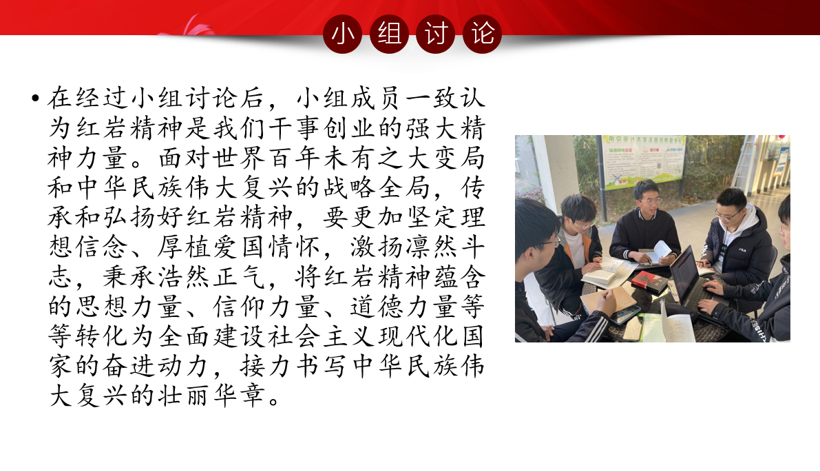 “弘扬红岩精神,赓续红色血脉”——传承并发扬红岩精神,我们当仁不让。为此,“红色百年”模块读书小组对《红岩》进行了深层次的阅读,理解了什么是真正的红岩精神。通过小组集体阅读,他们从不同的角度阐述了《红岩》书籍中革命先烈坚强的理想信念与精神品质,并用ppt形式呈现他们眼中的“红岩精神”——勇于追逐梦想,坚定理想信念,无惧困难牺牲。