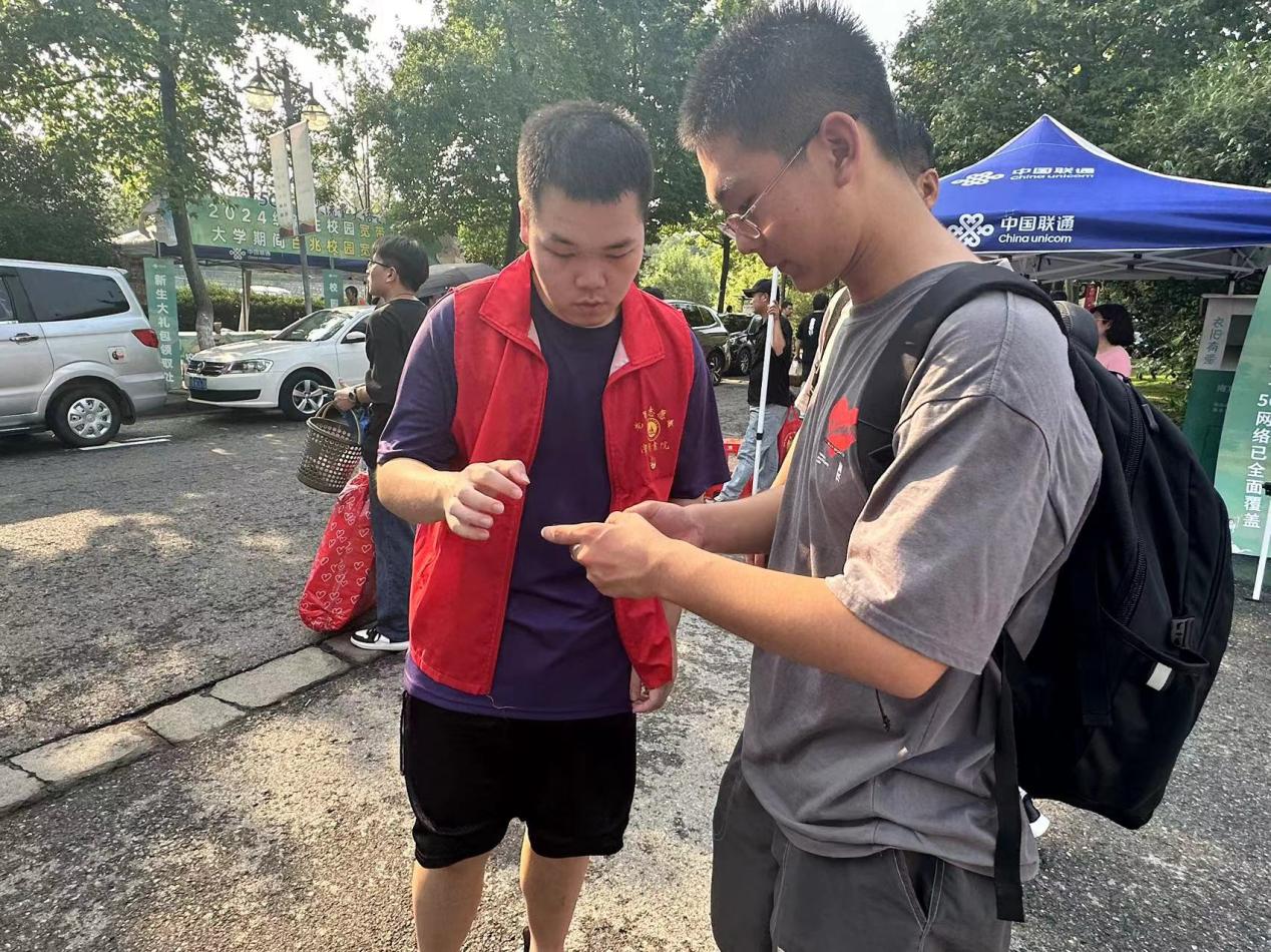 党员志愿者不惧炎炎酷暑、雨后闷热,积极投入迎新工作,为新生提供全方位的入住服务。引导新生找到宿舍,协助行李搬运,并详细介绍社区的各项基本设施和生活环境,确保新生能够快速适应大学校园生活。