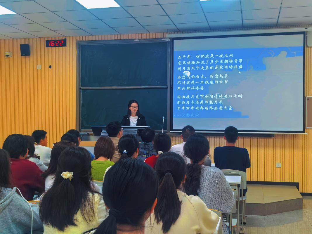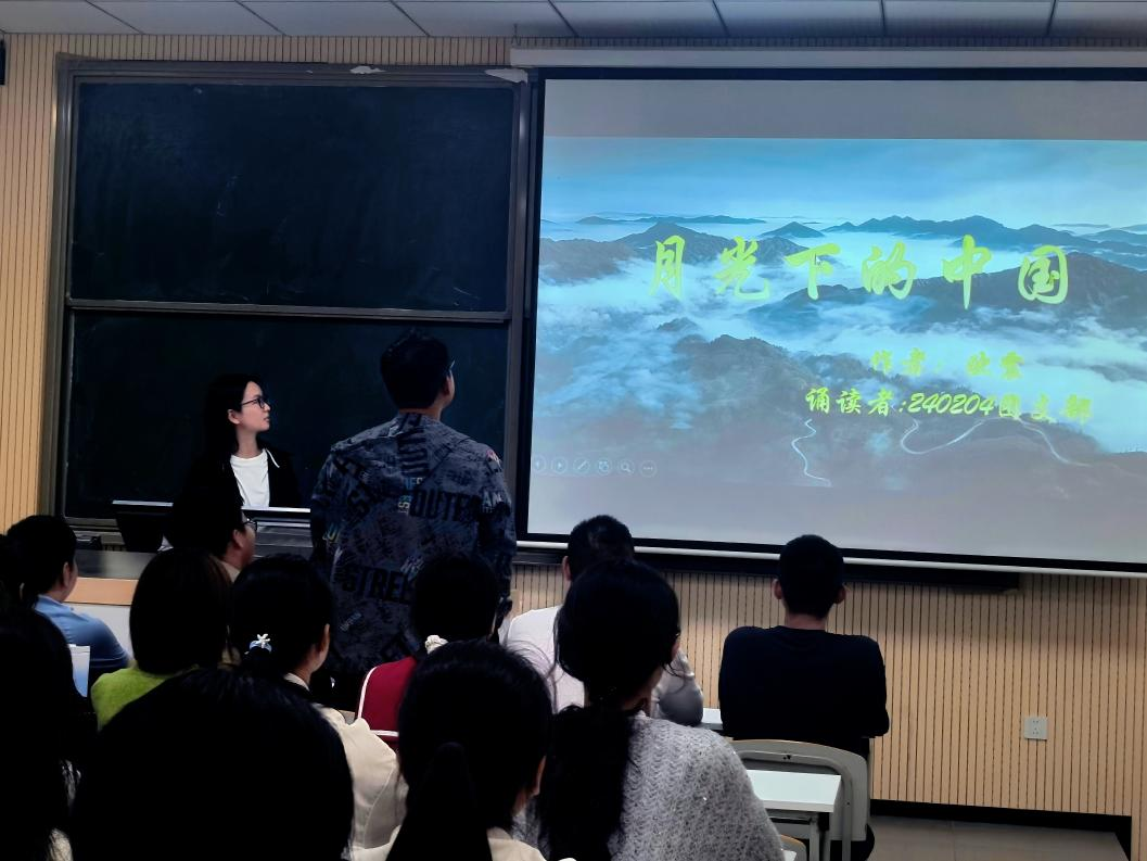 全体团员青年在团支书冯慧的带领下,朗读了欧震老师的《月光下的中国》。这首诗歌以优美的语言描绘了祖国大好河山的壮丽和人民为实现民族独立、人民解放而不懈奋斗的壮举。