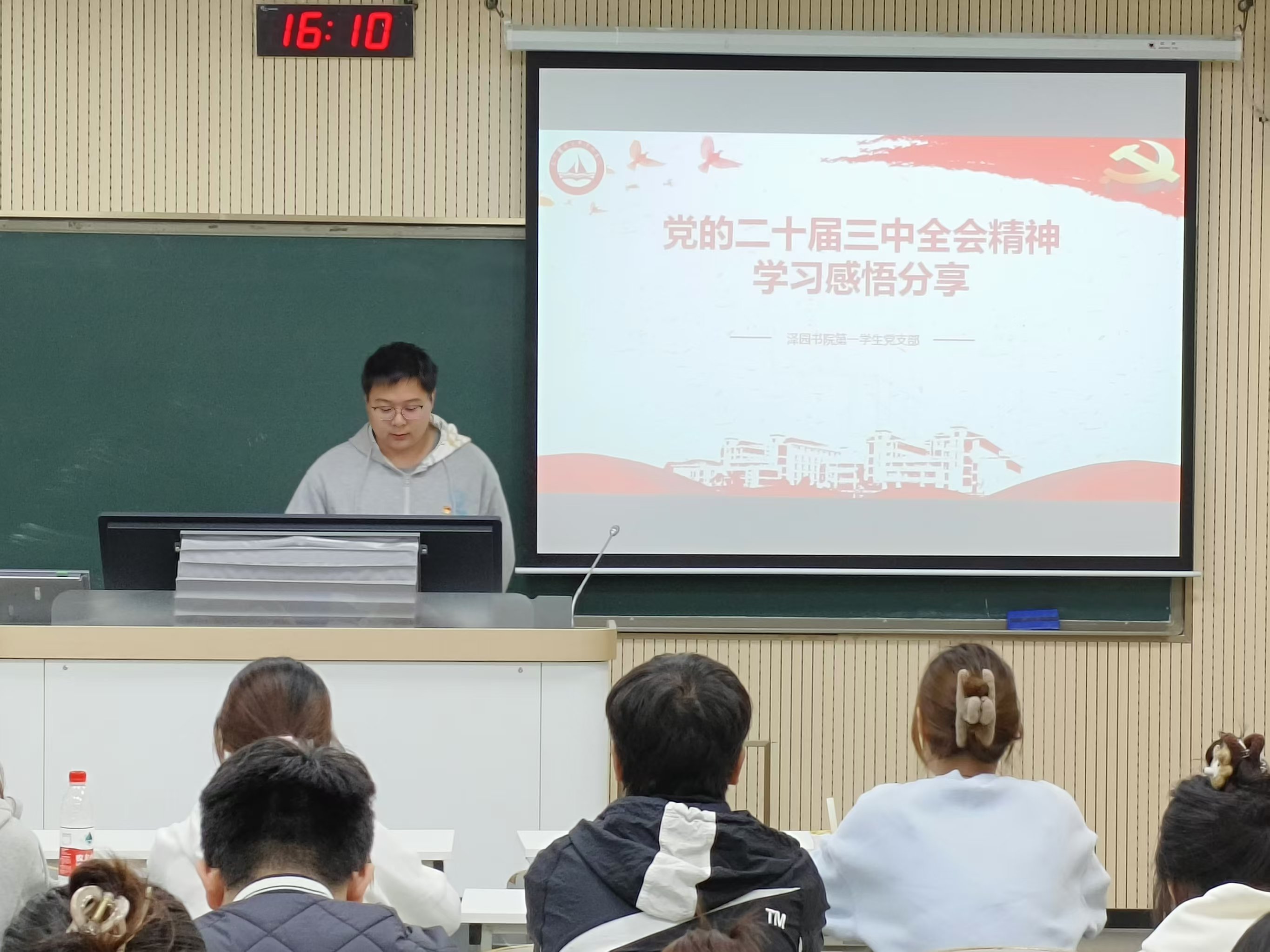 为深入学习党的二十届三中全会精神,引导广大党员将全会精神内化于心、外化于行,10月30日下午,泽园书院第一学生党支部在敏达楼105开展“学深悟透抓落实,砥砺奋进谱新篇”主题党日活动。本次活动由支部组织委员孟金玉主持,支部党员参加。